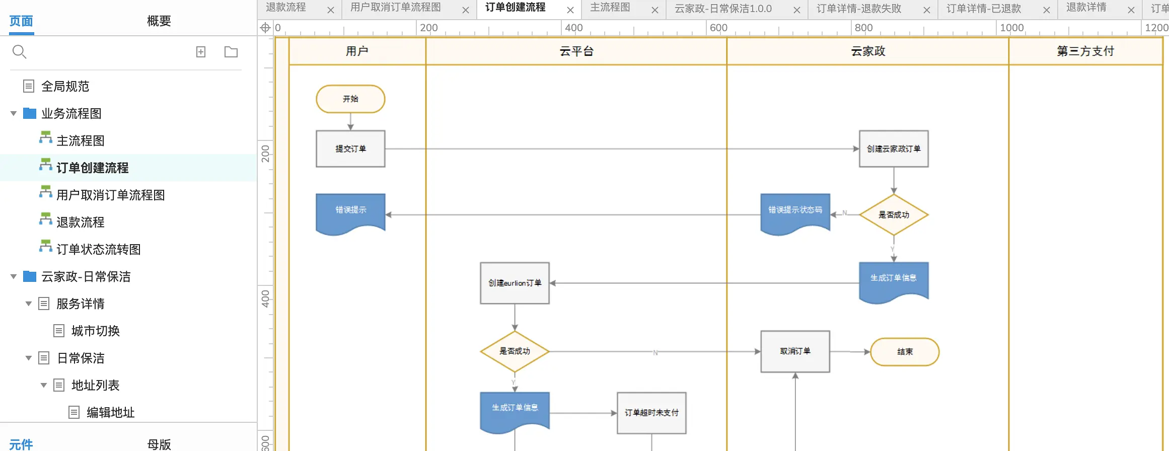 涉及角色为用户、云平台、到家保洁服务平台、第三方支付,4种角色的订单流。