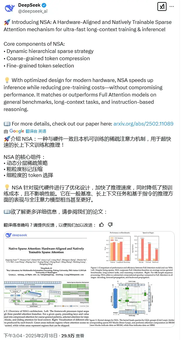 2月18日,DeepSeek在社交平台X上投下了一颗“技术炸弹”,发布了一篇关于NSA的纯技术论文报告。这NSA究竟是什么来头?它可是一种与硬件高度适配,能原生训练的稀疏注意力机制,简直就是为超高速长上下文训练与推理而生!