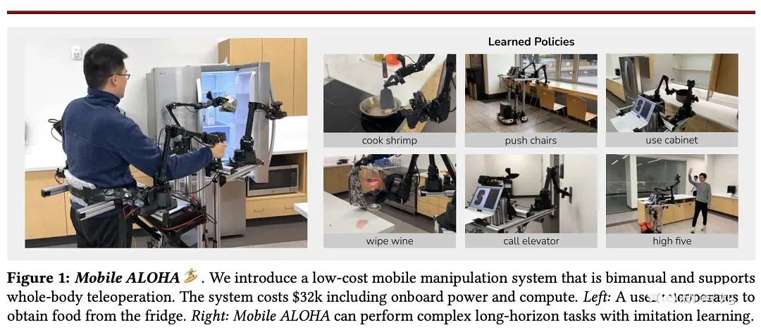经济实用: Mobile ALOHA便宜好用,让人们通过远程控制学习和收集数据,很容易推广。