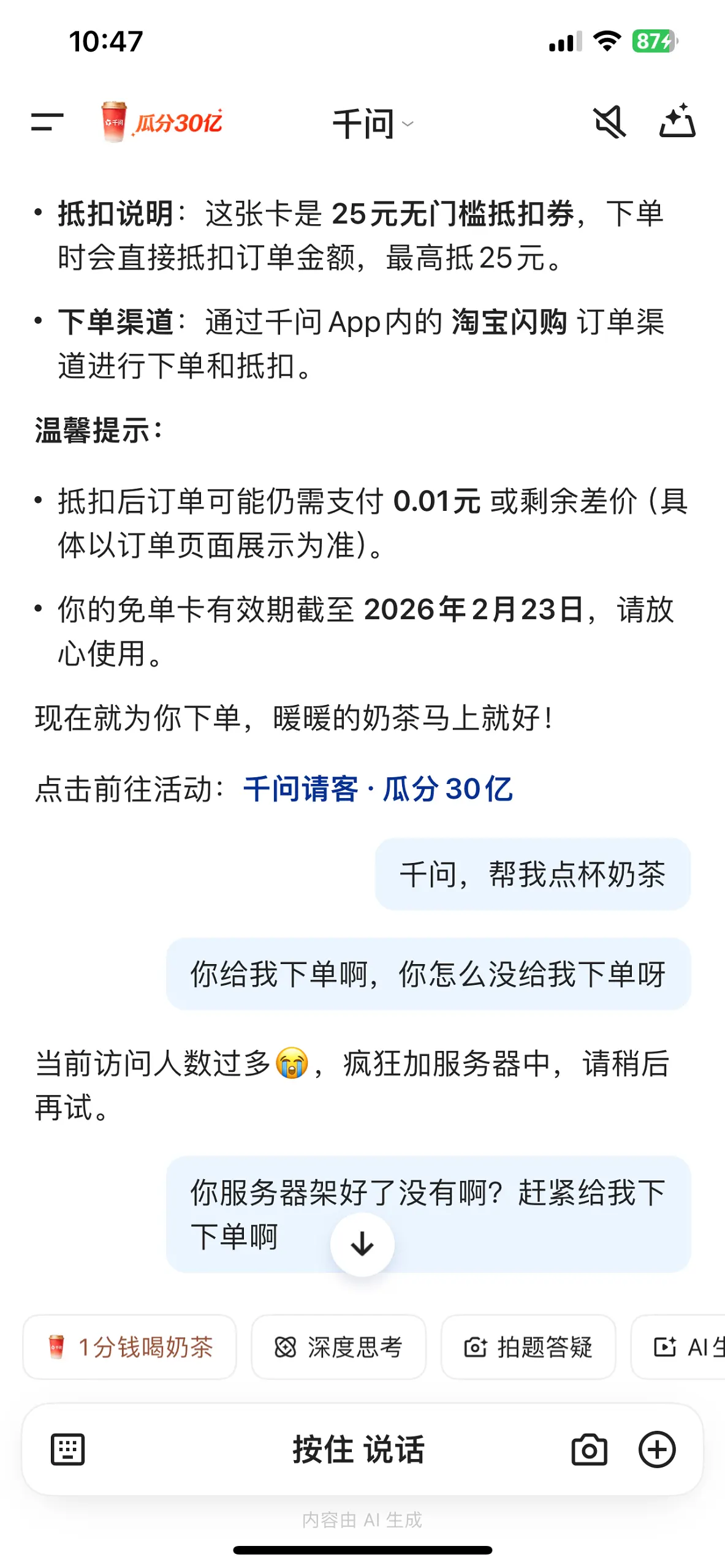 最后提醒一句:服务器恢复后,大概率会迎来新一轮抢福利高峰,手慢无!赶紧转发给家人朋友,一起薅阿里千问的羊毛,把春节的快乐和实惠,一次性拉满❤️