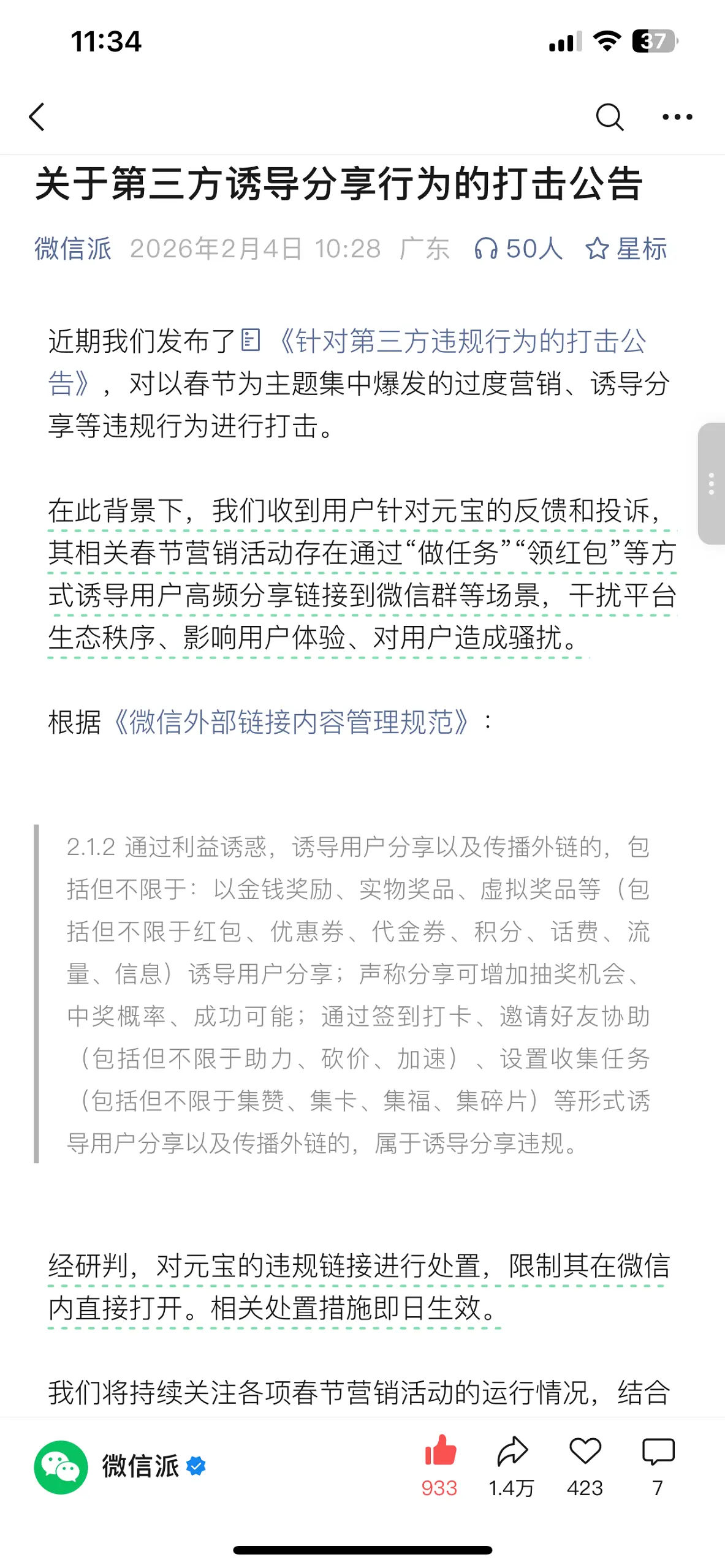 2026年2月4日,微信官方账号“微信派”发布公告,正式对元宝新春营销活动采取限制措施,核心举措为限制元宝活动违规链接在微信内直接打开,处置措施即日生效。微信官方明确表示,此次处置的核心原因是收到大量用户反馈与投诉,元宝新春营销活动存在通过“做任务”“领红包”等方式,诱导用户高频分享活动链接至微信群等场景,该行为严重干扰微信平台生态秩序、影响用户体验,且违反了《微信外部链接内容管理规范》中“禁止通过利益诱惑诱导用户分享外链”的相关规定(规范明确指出,以现金奖励、虚拟奖品等诱导用户分享,或通过邀请好友协助、设置收集任务等形式诱导分享,均属于违规行为)。
