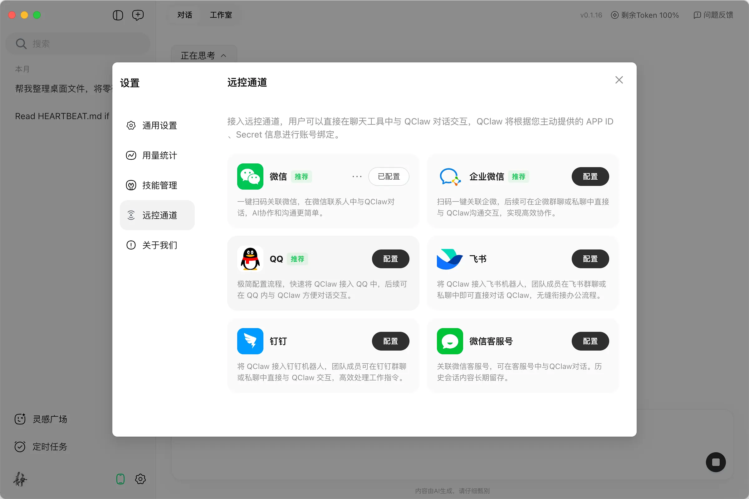 - 电脑端需更新至最新版QClaw,方可正常启用远程控制功能,建议在稳定网络环境下使用远控服务。