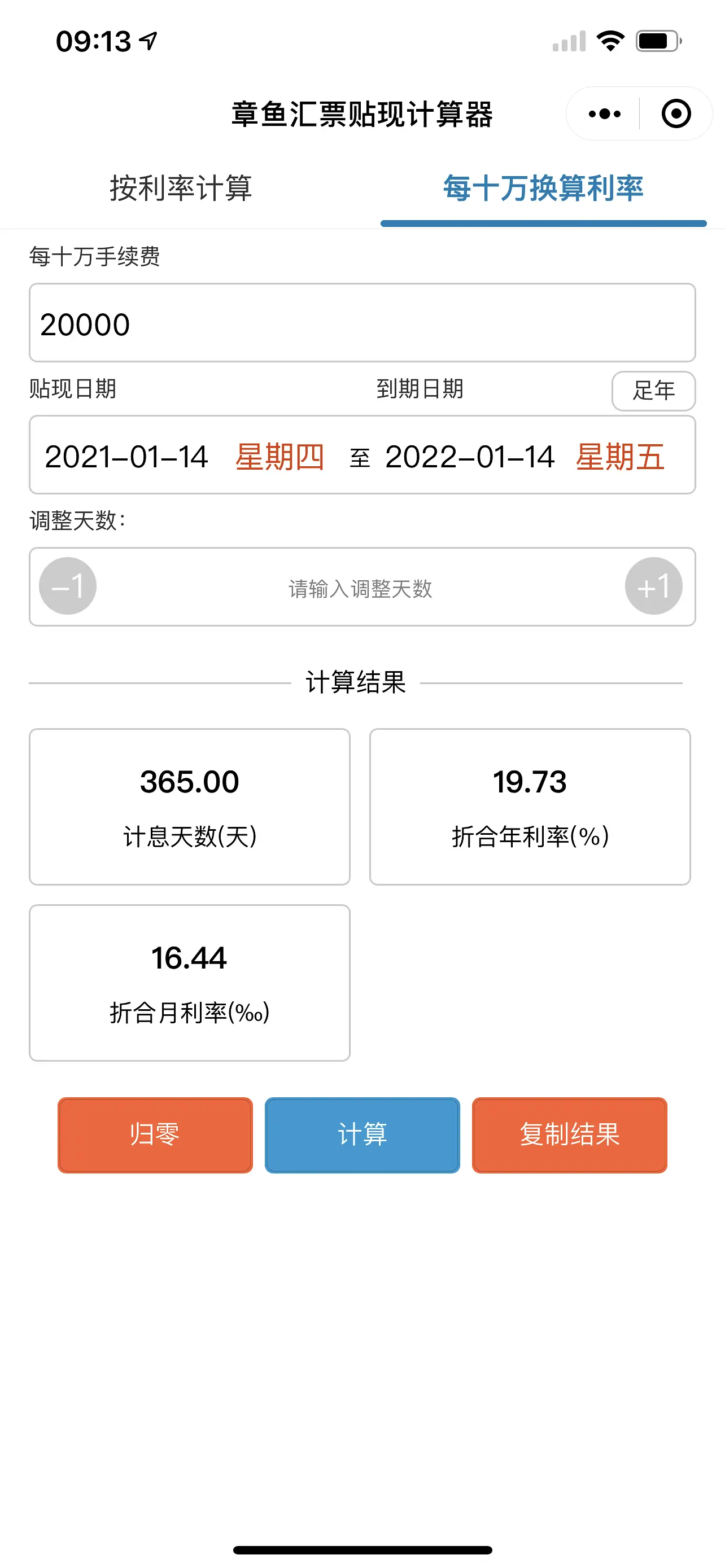章鱼汇票贴现计算器支持两种计算模式,分别为“按利率计算”和“没十万扣款换算利率”。