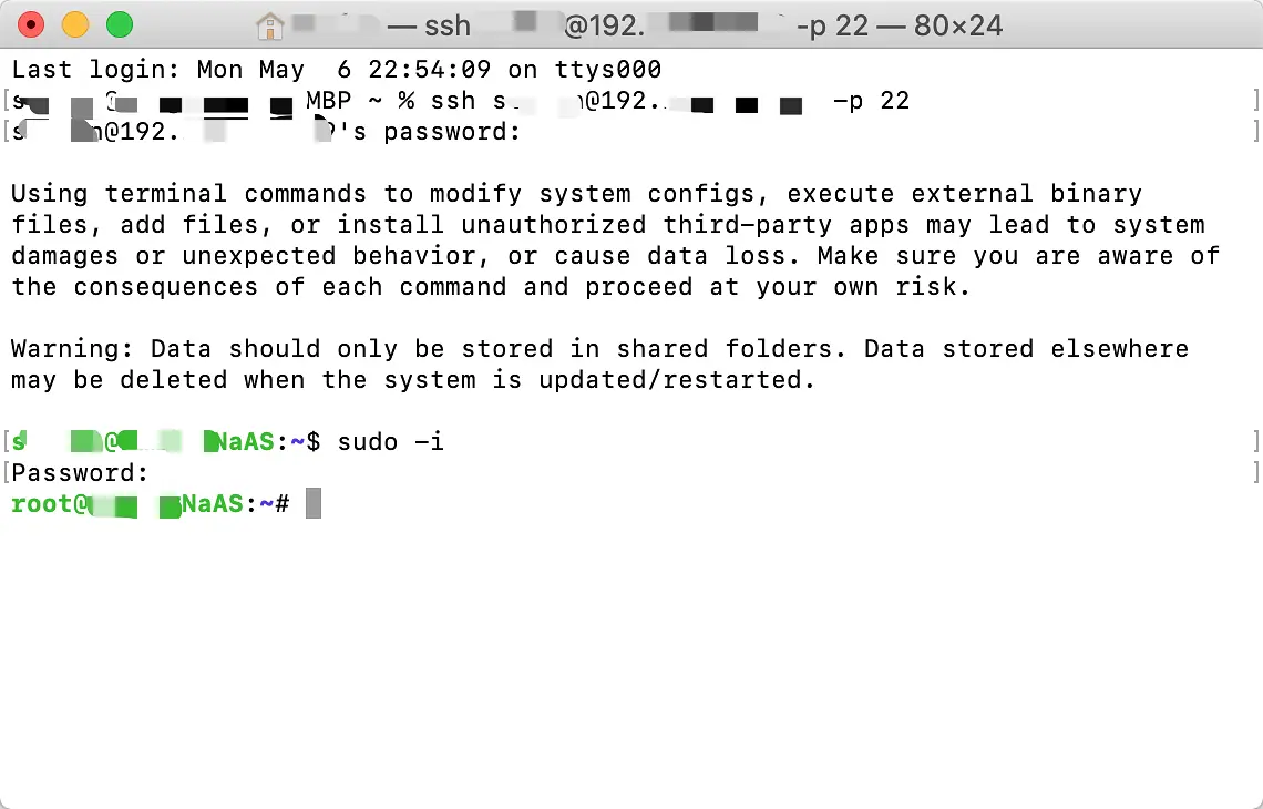 输入密码后就登录群晖了,然后还需要输入“sudo -i”命令再输入一次管理员密码就能切换为root权限用户。