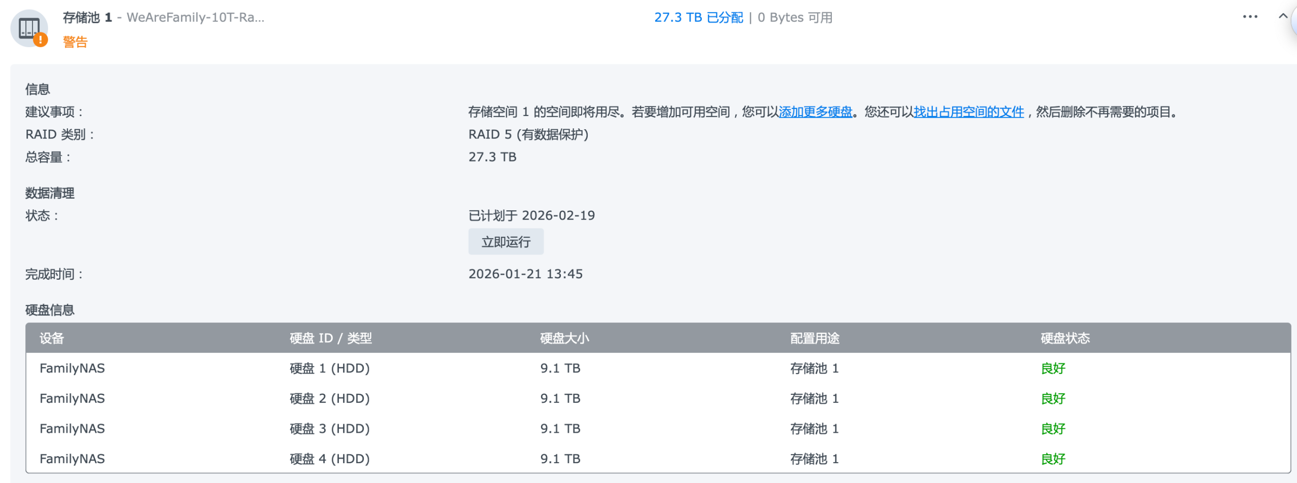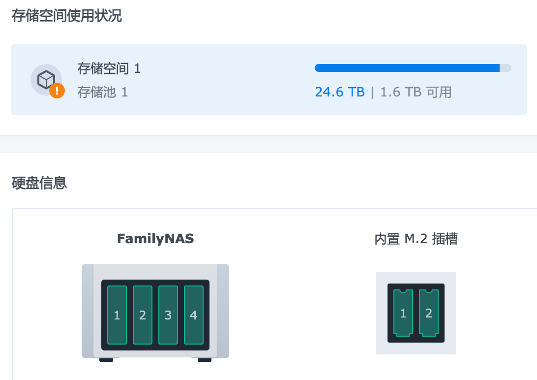 我是在21年8月份的时候开始部署私人存储方案的,采用的是群晖920+进行的,前前后后分别买了4块10TB的红盘,16G内存,两块1TBSSD,两块16G缓存SSD,还有UPS不间断电源,前前后后累计花费了将近2万元,4块硬盘组了Raid5实际可用存储空间位24.6TB(位了数据安全相当于少了15T的存储空间),期间由于小区有段时间不停跳闸导致我的一款1T 加速缓存SSD出现故障,一怒之下又采购了一个山水的家用UPS,所以呢大家可以根据自己的时间情况配置个人的存储需要。不同不懂技术的小伙伴是真不建议自己组建nas,但有绝对的数据安全的用户,如摄影、影视制作、编程等用户还是很推荐的。